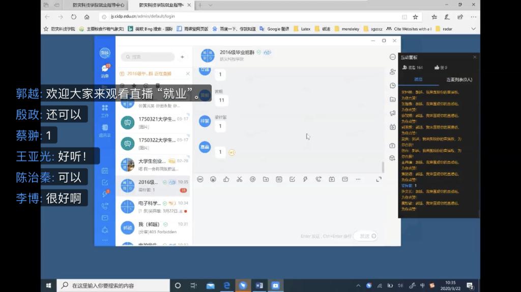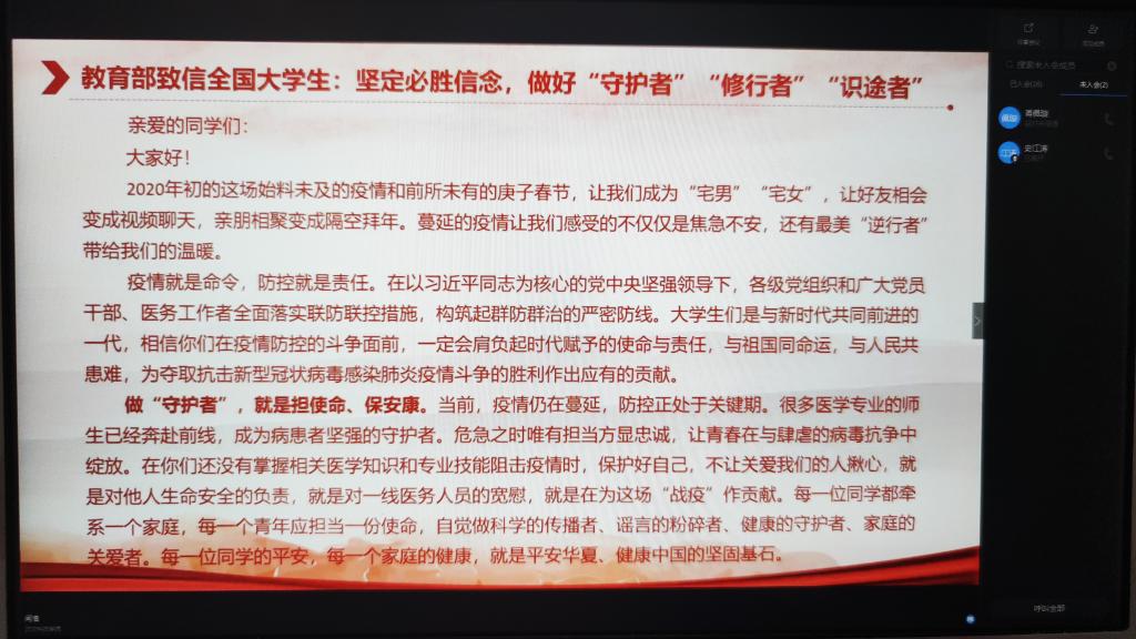 2016级是应届毕业班,面临毕业和就业的双重压力,为帮助同学们正确认识疫情,鼓励大家积极应对就业压力,3月16日—3月20日期间,电气工程及其自动化、测控技术与仪器、通信工程分别以专业为单位召开了疫情与就业线上主题班会。电控千亿国际网页版登录党总支书记贾甚杰和各专业教研室老师们参加了班会,学校教学科研教辅党总支书记刘文堂作为联系班级的中层干部应邀参加了电气专业班会。会上,辅导员郭越对学校目前的防疫工作进行详细介绍和要求,督促同学们及时完成每日健康打卡,并及时如实上报变动情况,强调了瞒报误报迟报的严重后果,并对不按时完成的同学进行批评指正。鼓励关心目前身处湖北省的同学,表扬在疫情过程中勇于担当的志愿者同学,传播正能量引导员工们战胜疫情的信心。因疫情影响,2020届毕业生面临的就业压力前所未有,同学们的就业也成了老师们最为关心的事情,利用本次线上主题班会的契机,与会领导老师们都对同学们的就业提出了指导建议,同时各专业老师及辅导员针对员工目前最关心的毕业设计、考研就业等问题进行了细致解答,同学们纷纷表示一定会与老师保持密切畅通的沟通,为毕业设计及就业工作的顺利开展打下坚实基础。千亿国际网页版登录党总支书记贾甚杰对主题班会进行了总结,鼓励同学们从疫情抗战工作中要学会思考,要更加爱国,学会如何尊重生命,学会如何理解规则,学会如何担当,并推荐同学们阅读3月16日习近平总书记给北京大学援鄂医疗队全体“90后”党员的回信,鼓励作为90后的防灾青年更应担当时代使命,青年一代有理想、有本领、有担当,国家就有前途,民族就有希望。