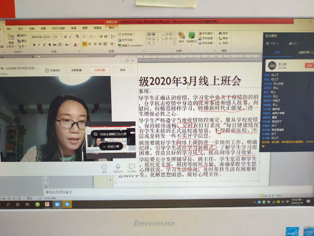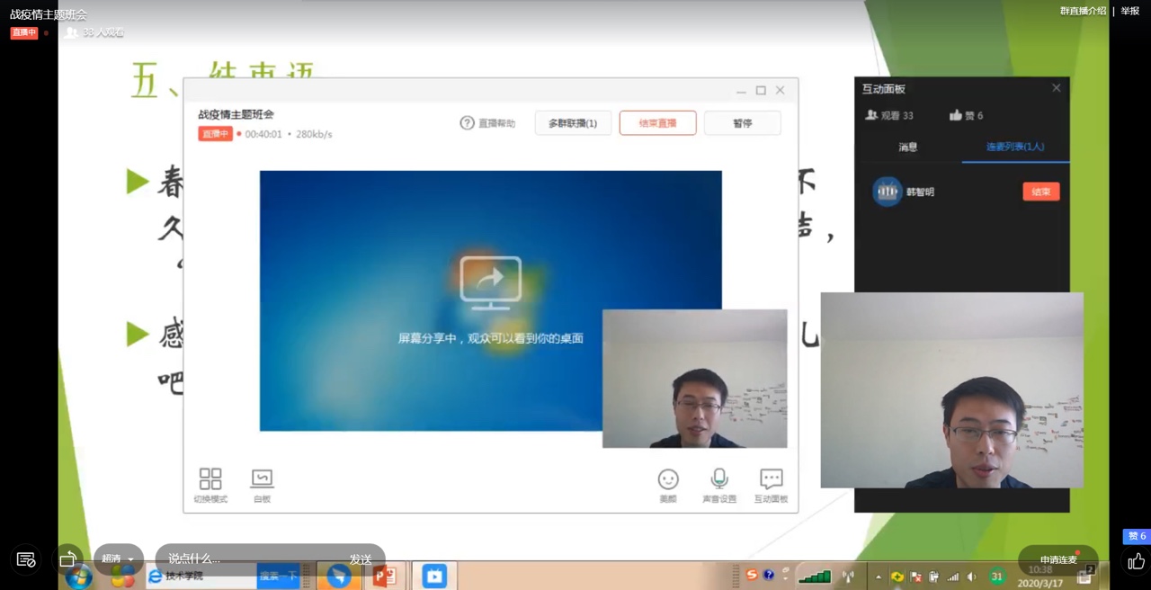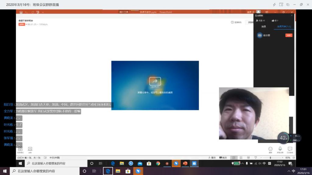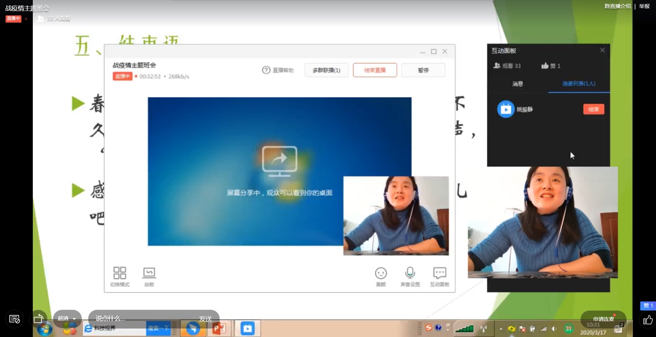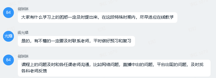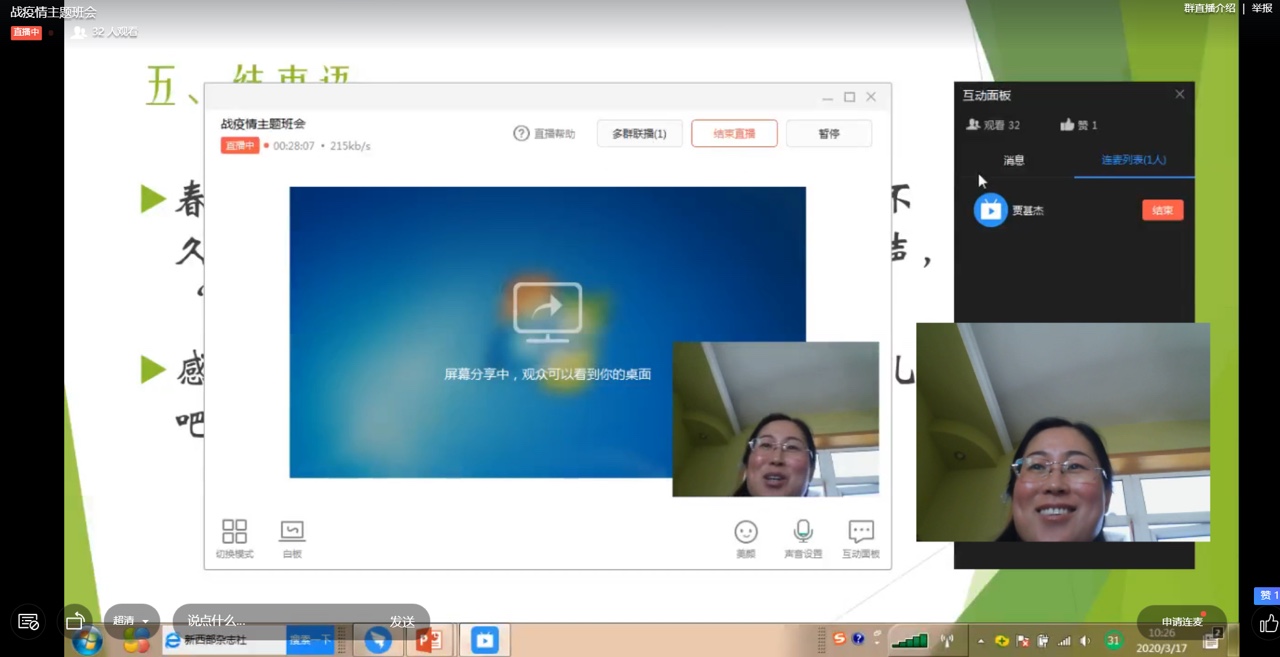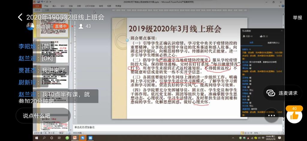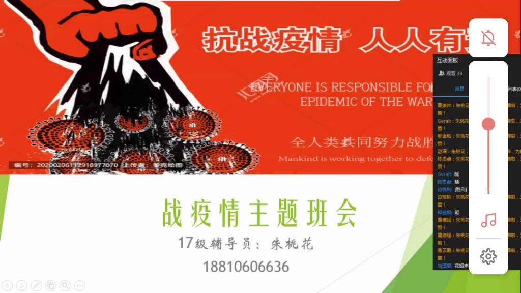 2017级的线上主题班会以班级为单位,通过钉钉直播形式召开。辅导员朱桃花主持,千亿国际网页版登录党总支书记贾甚杰、副院长姚振静以及2017级班主任韩志明、李亚男、王莉等老师参加。会上各班级湖北籍同学分享了自己在整个抗击疫情过程中的亲身经历和感受,积极参加抗击疫情志愿服务的志愿者同学分享了个人在抗击疫情志愿服务工作过程中的所见所感所悟,为同学们讲述了积极投身疫情防控志愿服务工作的难忘经历,以责任担当和实际行动展现我院新时代大员工的风采。各班级学习代表就班级同学线上学习情况做了总结报告,班主任就开学以来的线上教学工作作了简要总结,指出了线上教学中存在的问题,并对同学们如何更好开展线上学习、保证学习效果给出了指导建议。老师们和同学们积极发言,热烈讨论,亲切交流,本次线上主题教育班会收到良好效果。