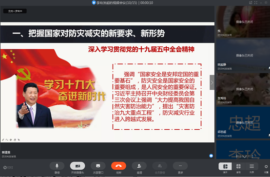 蔡建羡从五个方面做专题分享:1. 我们应通过深入学习贯彻党的十九届五中全会精神,把握国家对防灾减灾的新要求、新形势,习近平总书记强调的“大力提高我国自然灾害防治能力”,提出的“灾害防治九大重点工程”,预示着我国防灾减灾行业进入跨越式发展;2. 我们应把握国家对本科教育的新导向,即“以本为本 四个回归”;3. 我们应把握“大应急、全灾种”的机遇与挑战,主动适应“大应急、全灾种”体制,推动职能转变,整体提升服务保障效能;4. 深悟透我校“十四五”规划,通过学习学校在“十四五”规划中关于“人才培养”“学科建设”等方面的工作,更加明确学校未来五年的规划;5. 找出千亿国际网页版登录所面临的重要问题,明确学科定位,即立足地震、地质灾害,面向自然灾害和应急管理,作为“灾害链”中的监测支撑部分,重点围绕地震前兆、地震发生时获取数据的仪器研制、预警进行研究。