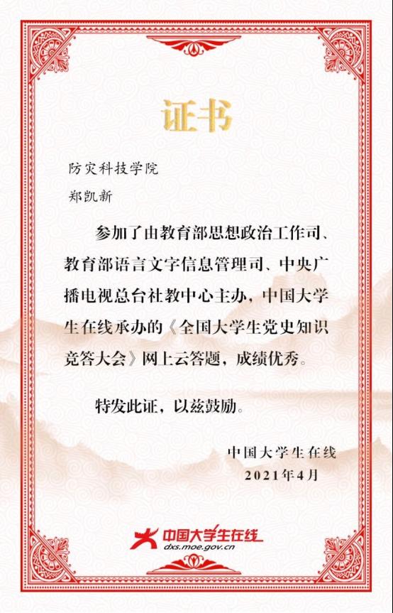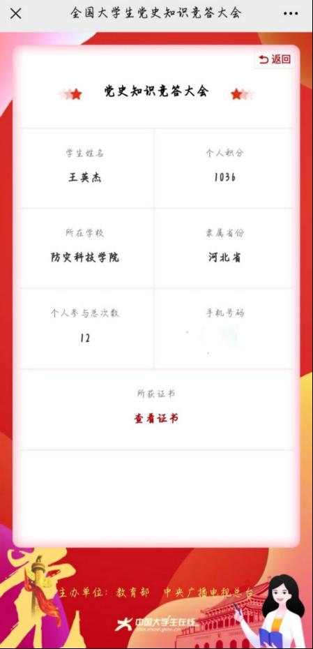 最后,由团总支·组织部对各班答题数据与名单进行汇总评比,评选出参与度最高的五个团支部。在本次党史知识竞答大会过程中,各年级同学均踊跃参加,参与班级包含来自三个年级的24个班,共418位员工。其中296人获得电子学习证书(图二,图三),4个团支部参与度达到100%。通过本次活动,促进了员工们对中国共产党建党以及发展历程的了解,深入领悟党团理论知识,同时重温了党的光辉历程,收获良多。