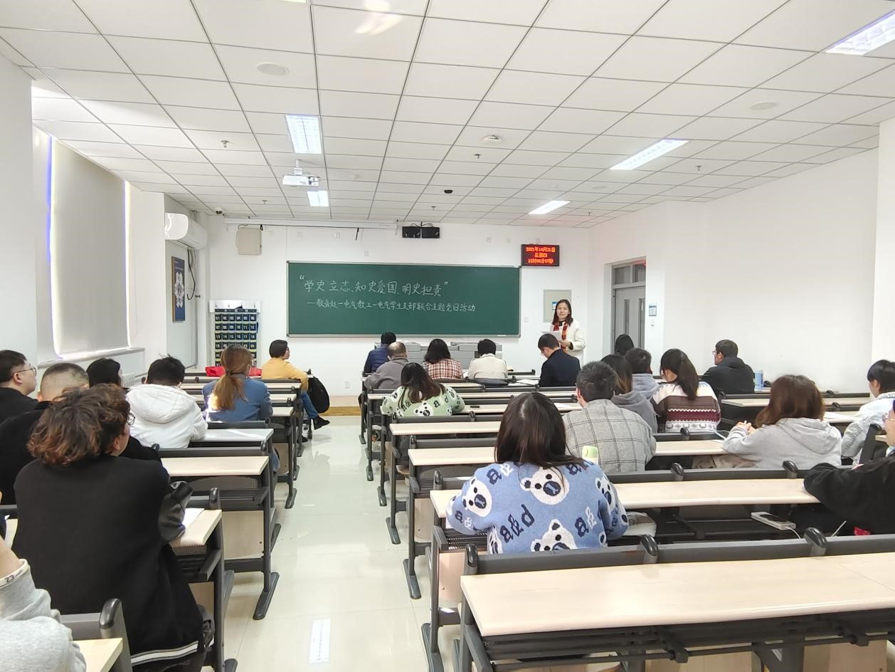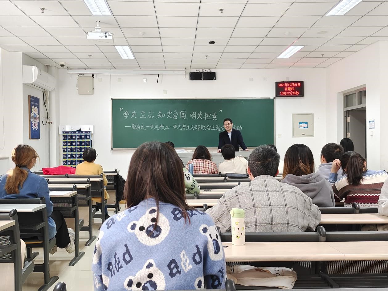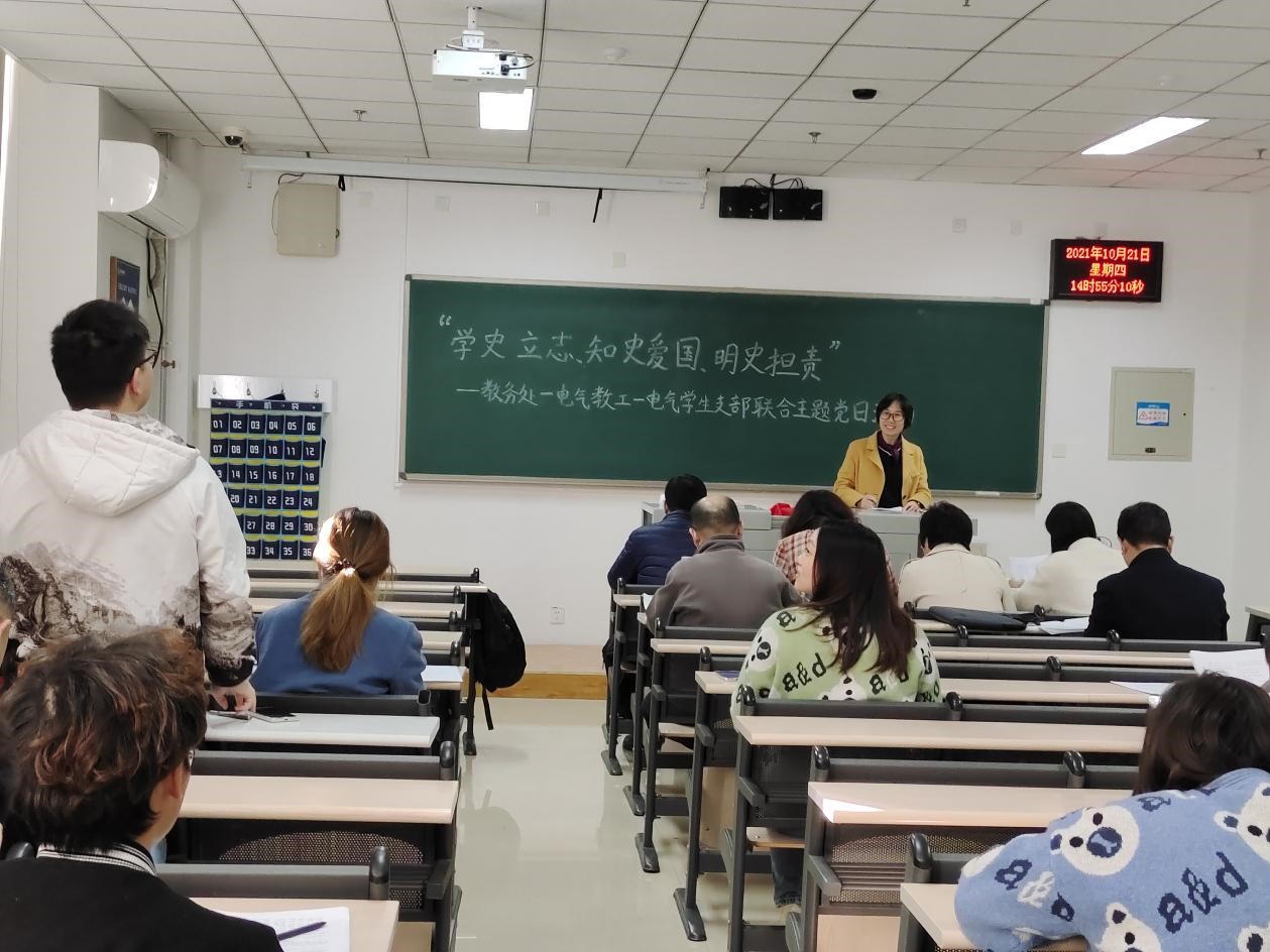 10月21日,千亿国际网页版登录电气师生党支部联合教务处党支部共同举办“学史立志、知史爱国、明史担责”主题党日活动。教务处党支部代表吴鹏老师、电气师生党支部全体党员参加本次活动,活动由电气教工党支部书记李立新主持。