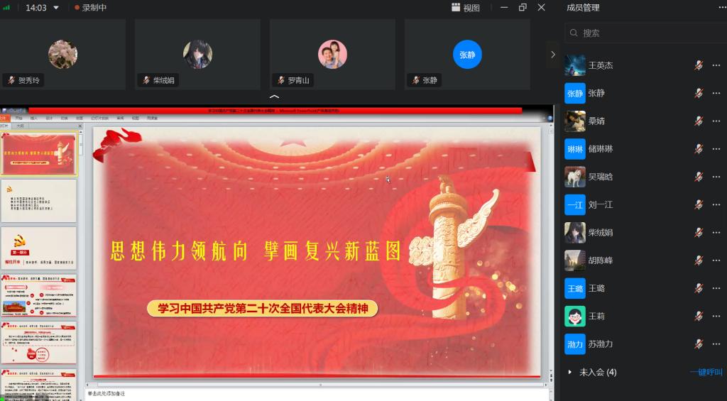 党支部书记贺秀玲,支委刘春侠、赵兰迎,教师党员代表罗青山和员工党员代表乔采青汇报了党的二十大学习收获,结合实际工作,几位教师一致表示在教学中认真贯彻新时代党的教育方针,立德树人,讲好课,关心好员工,与员工多交流,切实了解员工所需,为员工实践创新探索途径,提供助力。员工党员表示牢记习近平总书记在党的二十大报告中对青年的寄语,听党话、跟党走,不负时代、珍惜韶华,用实际行动立志做有理想、敢担当、能吃苦、肯奋斗的新时代好青年,让青春在全面建设社会主义现代化国家的火热实践中绽放绚丽之花。(撰稿人:贺秀玲)
