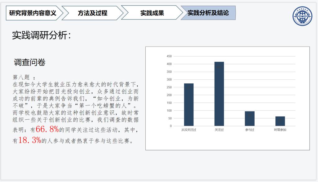 答辩过程中,各团队的答辩主讲人将团队介绍、项目背景、选题来源、实践过程、最终成果、社会评价等进行讲解介绍,分享实践经历,勾勒出完整的实践流程。各项目将专业特色、技术优势与社会实际相结合,聚焦乡村振兴,发掘乡村振兴战略,宣传防震减灾,助力冬奥盛会,专注创新创业,主题多彩,成果丰富,从社会实践的不同角度,探索大员工实践的意义,接受社会的锻炼。每个答辩人员完成展示之后,评委对其团队的实践方案和细节做出点评,指出部分问题,提出相关建议,最后进行评分。
