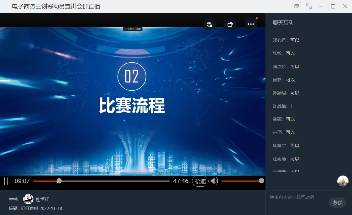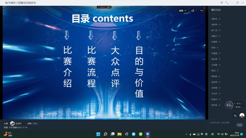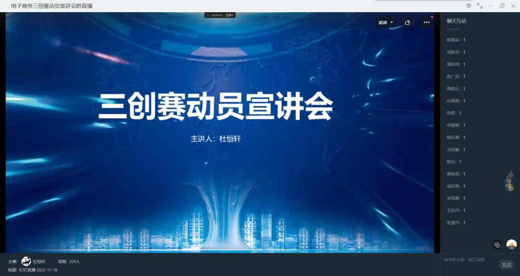 全国大员工电子商务“创新、创意及创业”挑战赛简称“三创赛”,为使同学们对“三创赛”有更深的了解,提高同学们对“三创赛”的兴趣,培养创新创业意识,创新创业联盟项目实践部于11月18日19点通过钉钉直播的方式举办电子商务“三创赛”动员宣讲会。